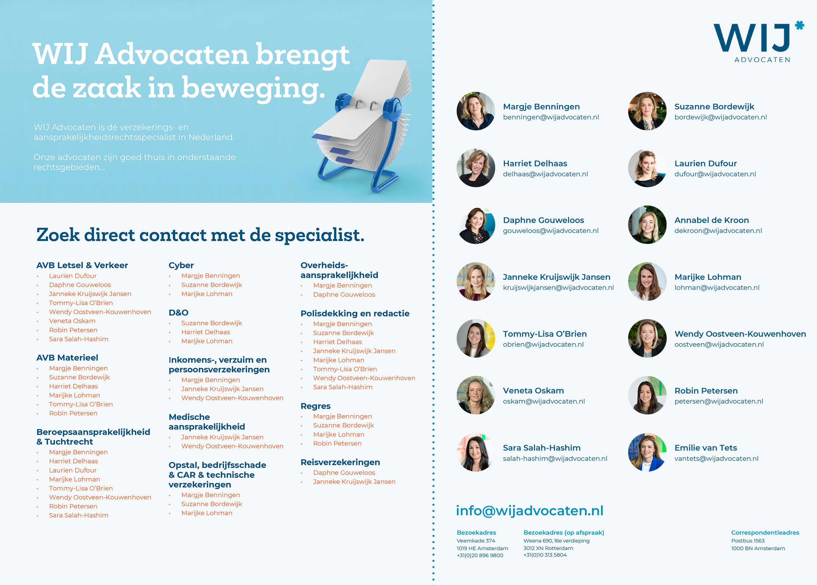 WIJ Advocaten is een nichekantoor op het gebied van aansprakelijkheids- en verzekeringsrecht. WIJ maakt adviezen begrijpelijk voor iedereen en is eerlijk over slagingskansen. We zijn alert op wat er binnen de organisatie van onze cliënt verandert. Zodat we kunnen meebewegen als de situatie daarom vraagt.